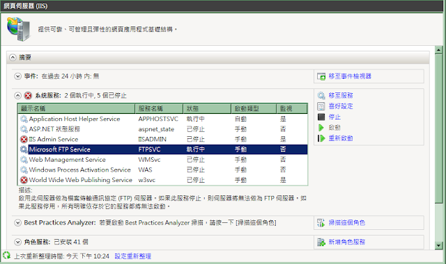 在安裝好「Microsoft FTP Service」服務後,接下來就可以來組態 FTP 站台。
